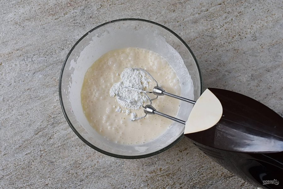 Всыпьте муку, смешанную с разрыхлителем, ванилином и щепоткой соли. Лопаткой быстро замесите густое тесто.