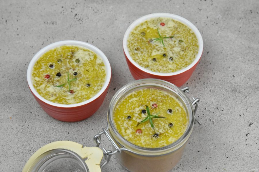 Оставшееся сливочное масло растопите вместе с щепоткой тимьяна и горошинами перца. Залейте паштет сверху слоем растопленного масла.