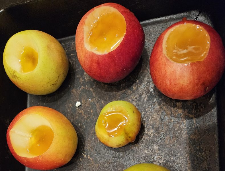 Установим яблоки в жаропрочную форму, наполним каждое получившейся смесью, сверху выльем по столовой ложке мёда.