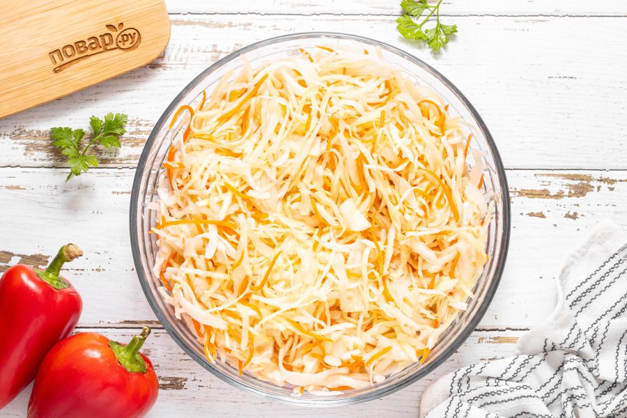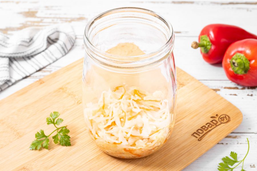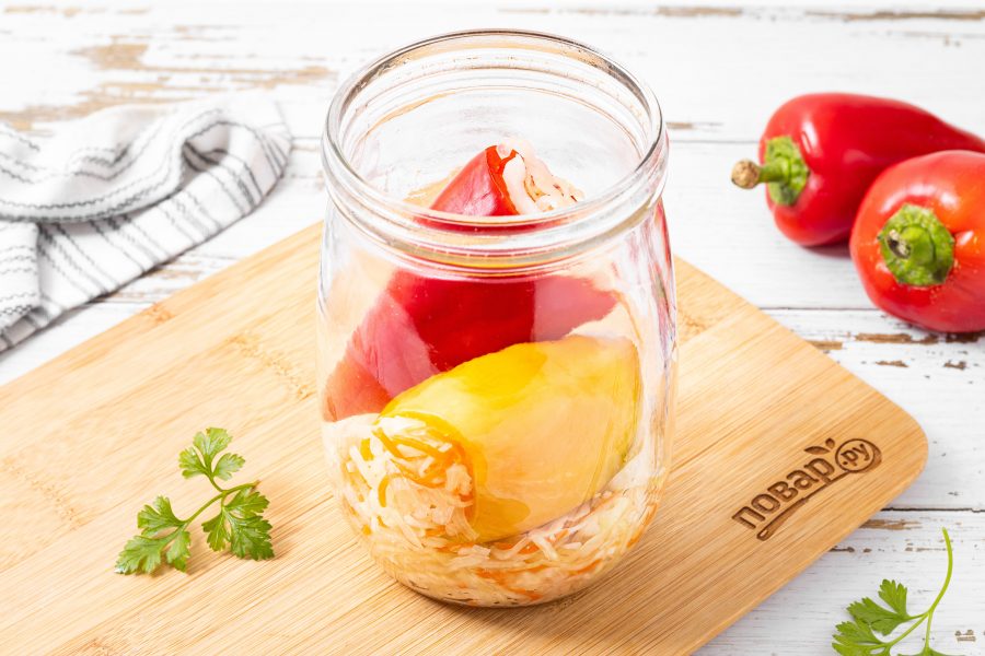 Заполните так всю банку, пока не кончатся перцы. Верхний слой должен быть из капусты. Оставьте овощи скашиваться на 5-7 дней. Каждый день дважды прокалывайте капусту деревянной палочкой и выпускайте воздух, чтобы она не горчила. После переложите готовые перцы с капустой в холодильник на хранение.