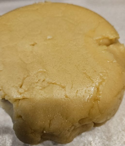 Затем тесто вынимайте из блендера ложкой и немного вымешивайте руками, образовывая ком. Тесто необходимо охладить, чтобы оно было пригодно для раскатывания и формирования печенья. Отправьте его в холодильник минимум на 30 минут, обернув пищевой плёнкой.