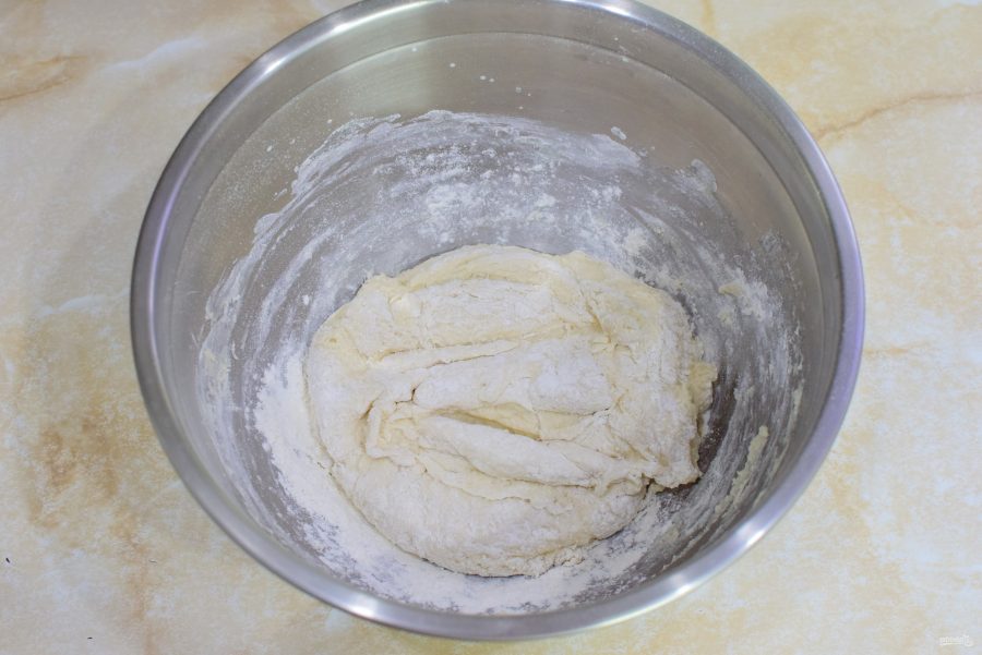 Постепенно добавляйте муку и замешивайте тесто. В количестве муки ориентируйтесь по консистенции готового теста. Оно получится мягкое и пластичное. Почти не будет липнуть к рукам. Накройте его пленкой и оставьте постоять пока готовится начинка.