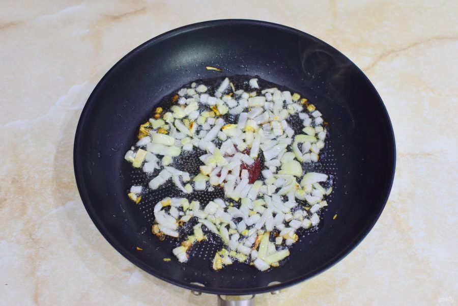 Для приготовления начинки обжарьте мелко нарезанный лук в течение 1-2 минут.