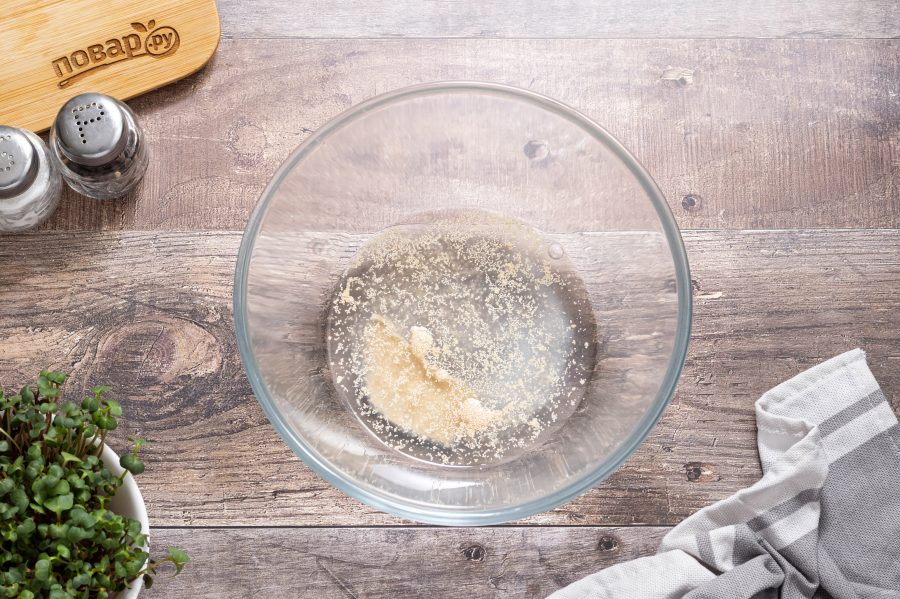 Для теста разведите в теплой воде дрожжи с сахаром. Все хорошо размешайте.