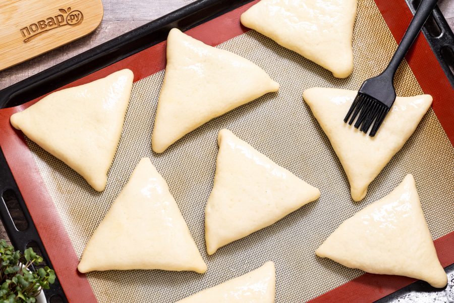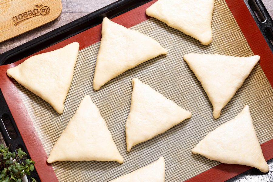 Выложите слепленные пирожки швом вниз на противень застеленный пергаментом или на силиконовый коврик. Накройте пленкой или полотенцем, дайте подняться 20 минут.