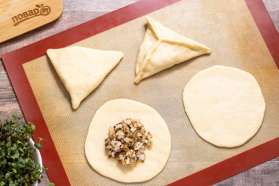 Затем каждый шарик раскатайте до толщины 3-4 мм. В центр выложите 1 ст.л. начинки с горкой, затем скрепите края так, чтобы получился треугольник. Слепите так все пирожки, пока не кончится тесто.