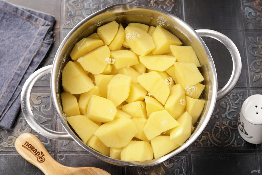 Картофель хорошо помойте под проточной водой с щеткой, затем очистите от кожуры. Нарежьте крупные клубни на несколько частей — так они быстрее сварятся. Сложите картошку в кастрюлю и залейте чистой холодной водой.