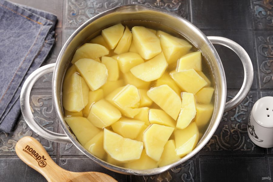 Готовность проверьте ножом — он легко проткнет картофелину. Слейте с картошки всю воду.