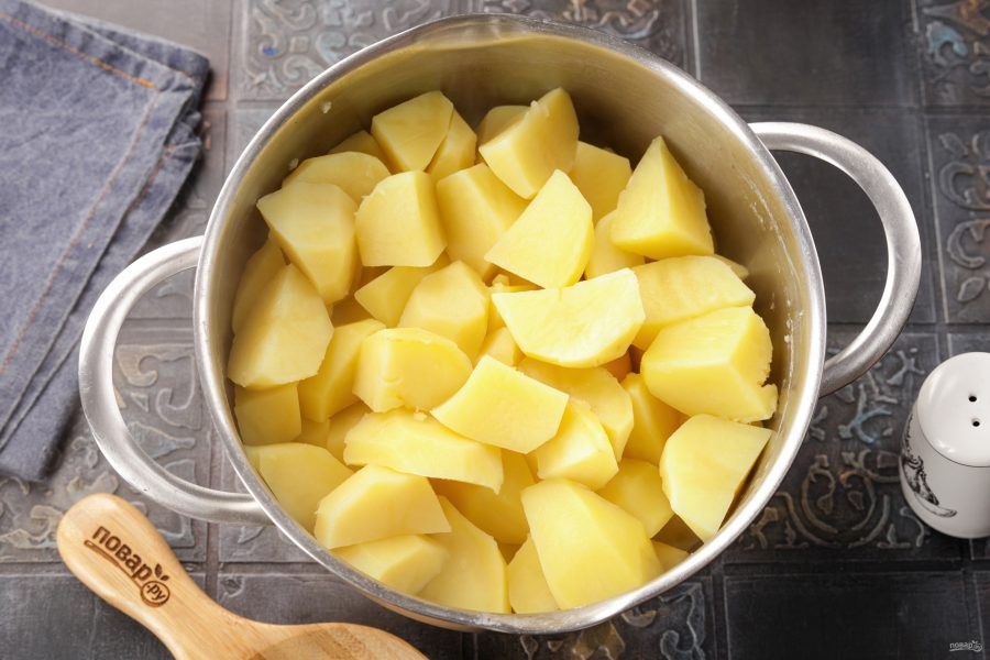 Подготовьте все ингредиенты по списку. Картошку возьмите хорошо разваривающихся сортов, именно из такой получится самое вкусное пюре. Молоко подойдет любой жирности. К выбору масла отнеситесь со всей серьезностью — берите качественное, без растительных добавок, соответствующее ГОСТу. Количество картофеля я указала уже в очищенном виде.