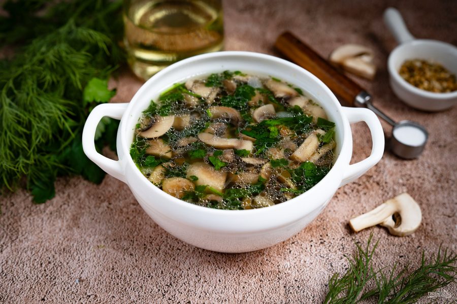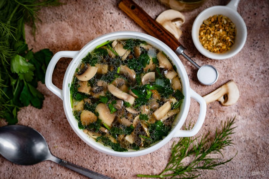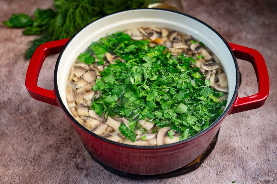 Добавьте измельченную свежую зелень, перемешайте и снимите с плиты готовый суп уже через 5 минут. Оставьте грибной суп настояться в течение 20 минут под закрытой крышкой.