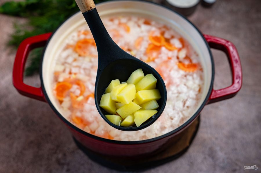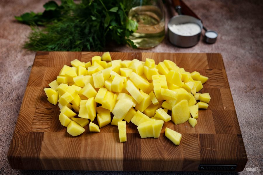 Картофель нарежьте небольшими кубиками.