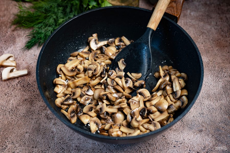 Обжаривайте шампиньоны, помешивая лопаткой, до полного выпаривания жидкости и появления легкого золотистого оттенка.