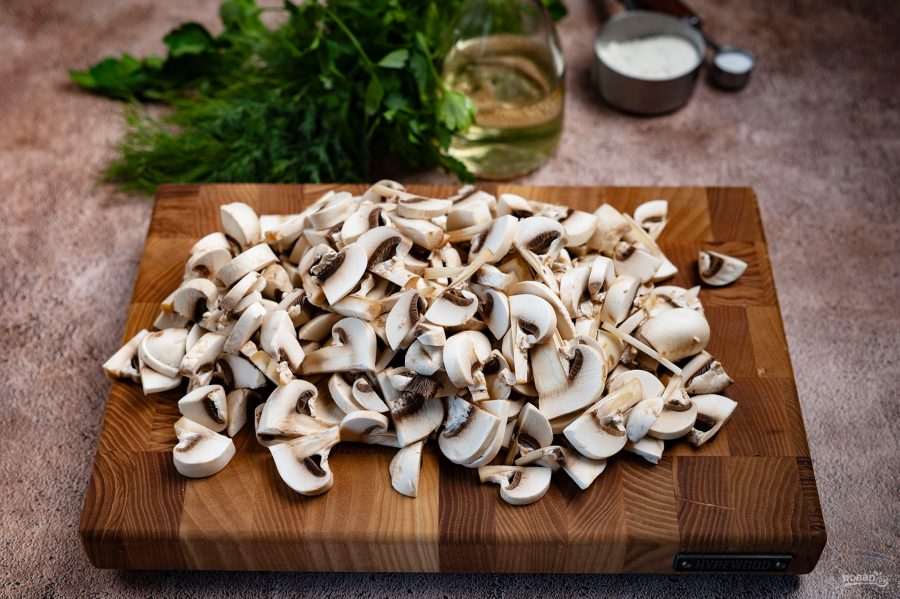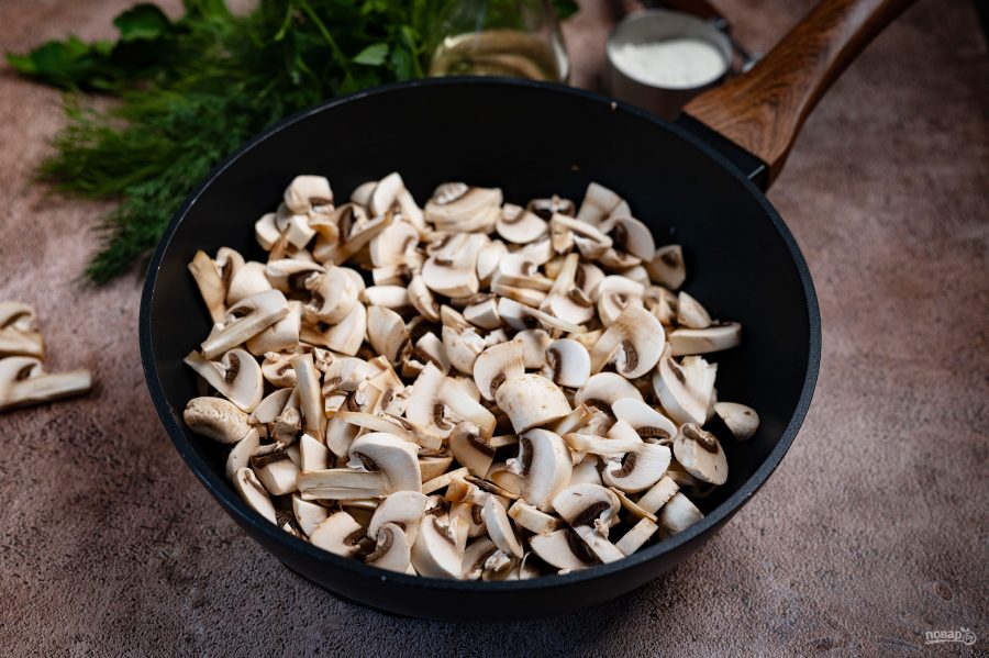 Шампиньоны нарежьте пластинами.