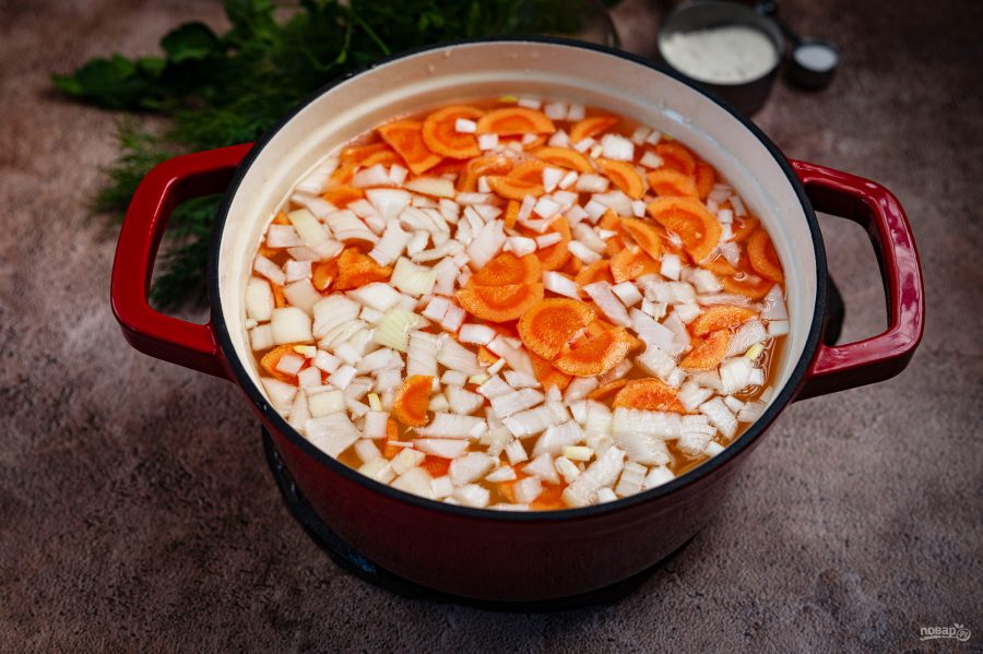 В кастрюле доведите до кипения указанное количество воды. Выложите в закипевшую воду лук и морковь.