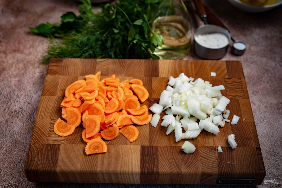 Нашинкуйте небольшими кубиками лук репчатый и нарежьте тонкими кружочками или полукружочками морковь.
