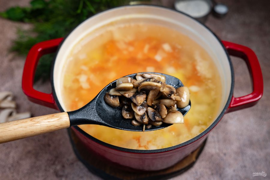 Добавьте обжаренные шампиньоны в суп.