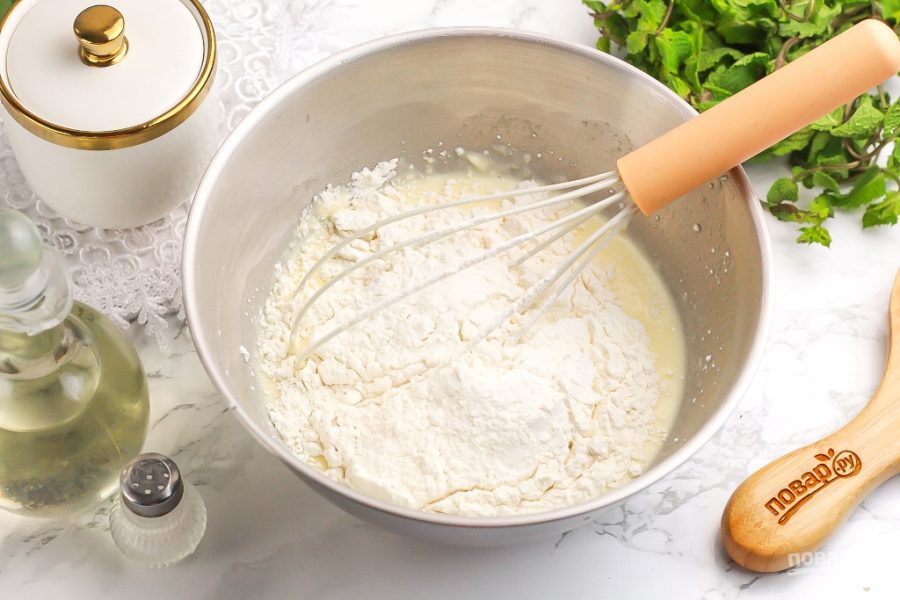 Всыпьте по частям пшеничную муку высшего сорта и вмешайте ее венчиком. Добавьте разрыхлитель и еще раз все тщательно перемешайте. Масло в тесто не добавляйте.