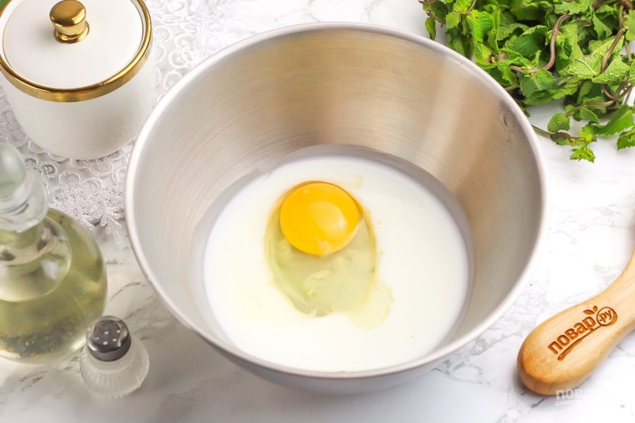 Куриные яйца вбейте в глубокую емкость и влейте туда же кефир любой жирности. Желательно прогреть кефир хотя бы до комнатной температуры, чтобы оладьи получались еще пышнее. Если прогреете его до 30 градусов, то следите за тем, чтобы яйцо не свернулось, сразу же все взбейте.