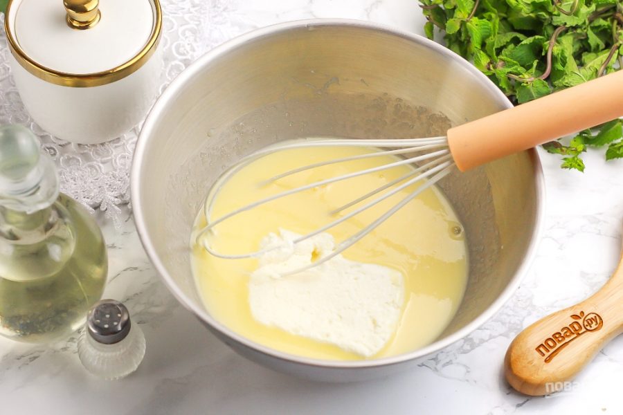 Выложите во взбитую массу творог и тщательно все размешайте, чтобы он отлично распределился по яичной массе. Если творог у вас сбитый, крупными комками, то сначала разотрите его вилкой, а лишь после добавляйте в массу.
