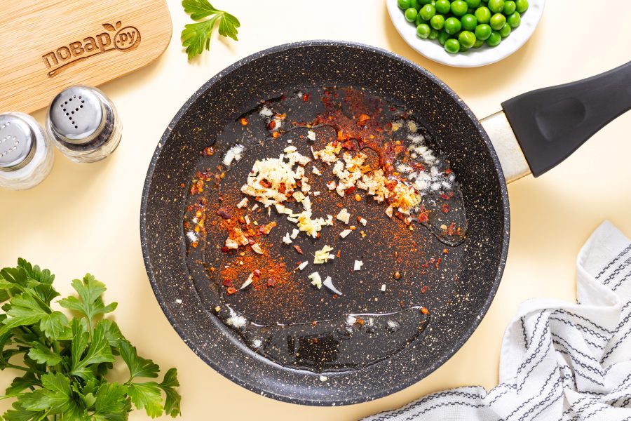 Разогрейте сковороду на среднем огне и обжарьте в растительном масле несколько секунду чеснок с корнем имбиря и перцем чили до раскрытия аромата.