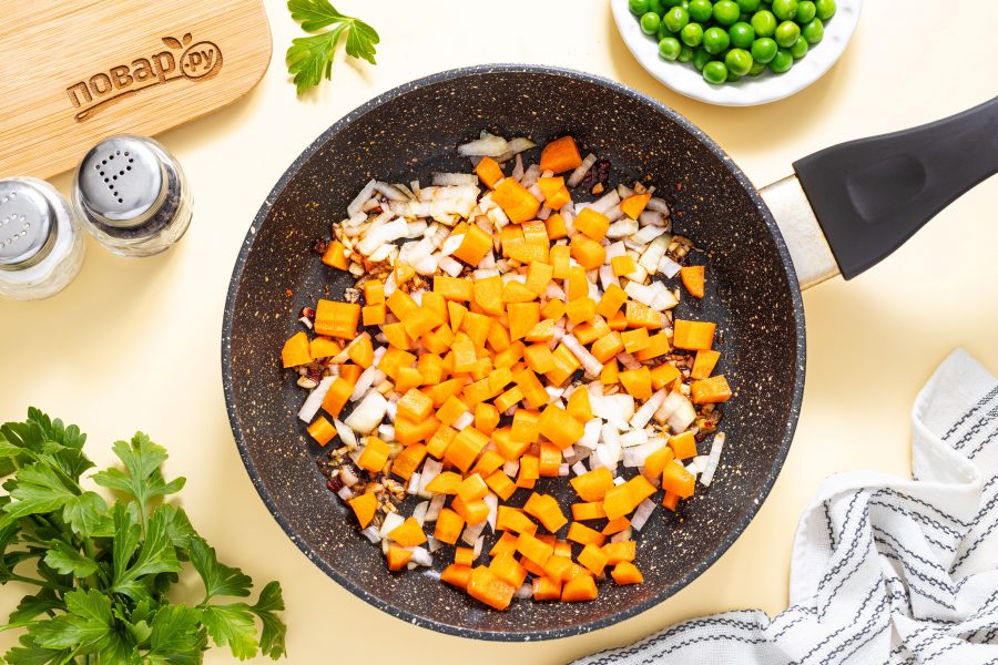 Нарежьте кубиками репчатый лук, морковь и болгарский перец. Чеснок и корень имбиря мелко порубите ножом.