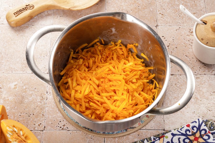 Тыкву очистите от кожуры, уберите семечки. Нарежьте тыкву кубиками или натрите на крупной тёрке, мне нравится второй вариант. Добавьте в кастрюлю к рису.