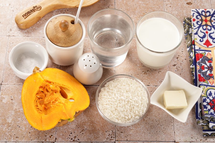 Подготовьте все ингредиенты по списку. Вес тыквы я указала уже в очищенном виде. Рис возьмите круглозерный, не пропаренный, иначе он не разварится.