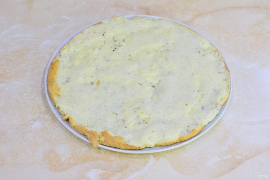 Готовую яичную лепешку с помощью лопатки отделите от сковороды. Переверните на крышку от сковороды, а затем на большую тарелку. Пусть немного остынет.