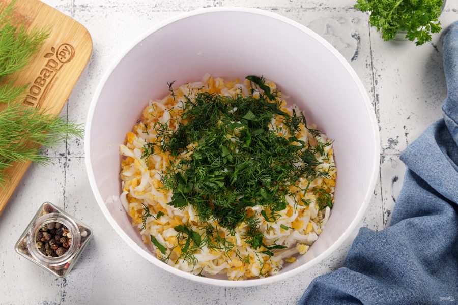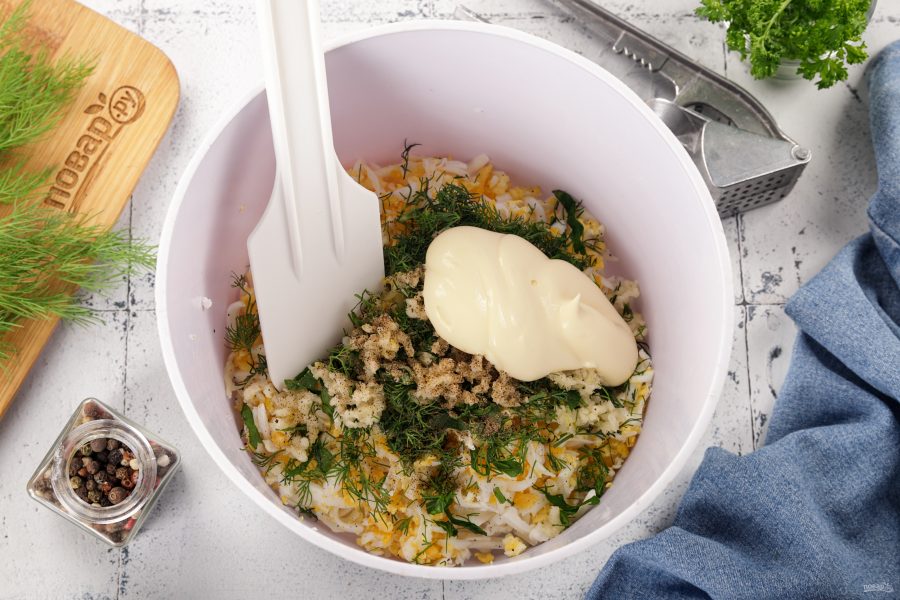 Заправьте салат майонезом и тщательно перемешайте. Попробуйте салат и доведите до вкуса. Вполне возможно, что вам захочется добавить щепотку-другую соли.