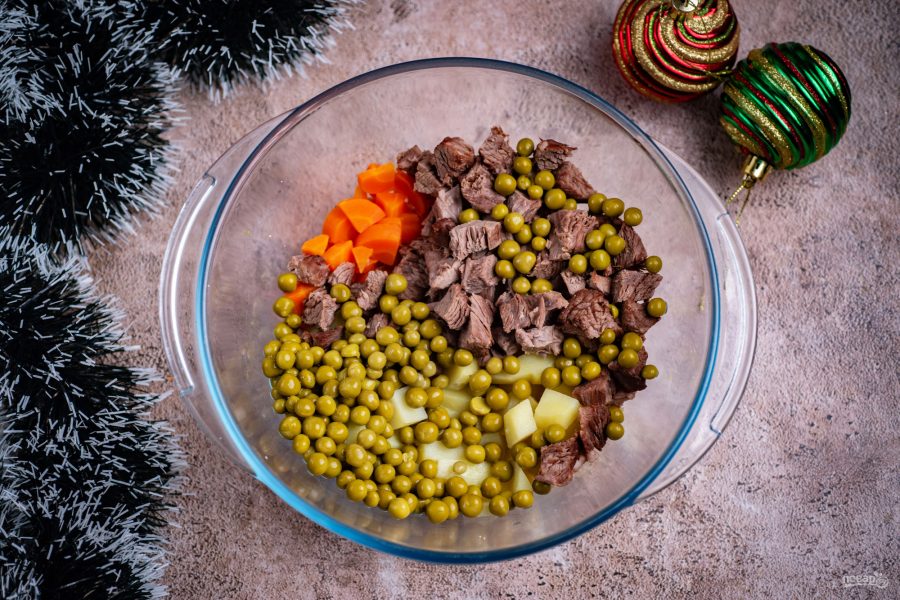 В просторную миску выложите кубики картофеля, моркови, говядину и горошек.