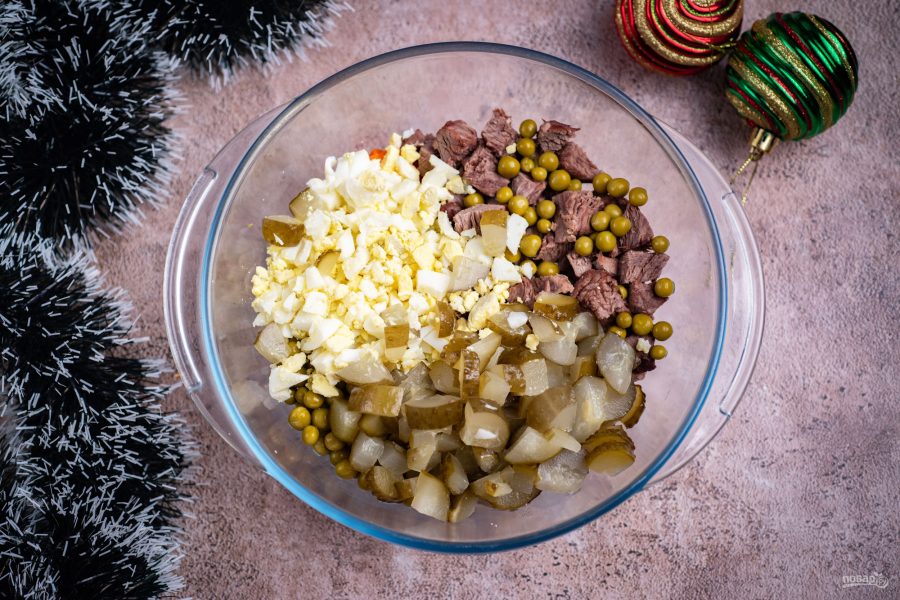 К ним добавьте кубики соленых огурцов и измельченные яйца.