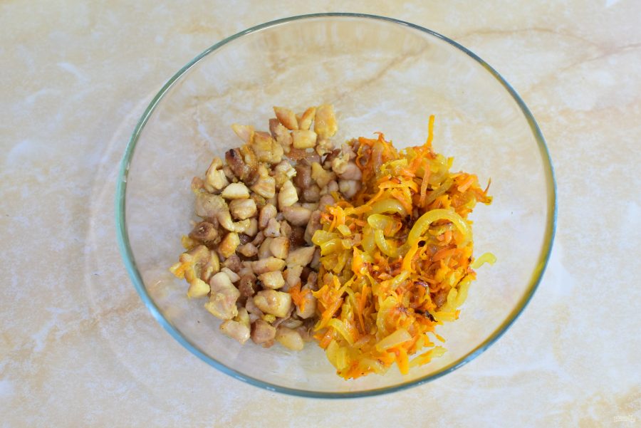 Куриное мясо нарежьте на небольшие кусочки и обжарьте до готовности 15-20 минут. По вкусу добавьте соль и специи.