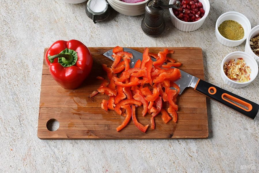 За полчаса до готовности мяса можно начинать подготовку ингредиентов салата. Красный лук нашинкуйте тонкими полукольцами и замаринуйте в винном уксусе, добавив немного соли.