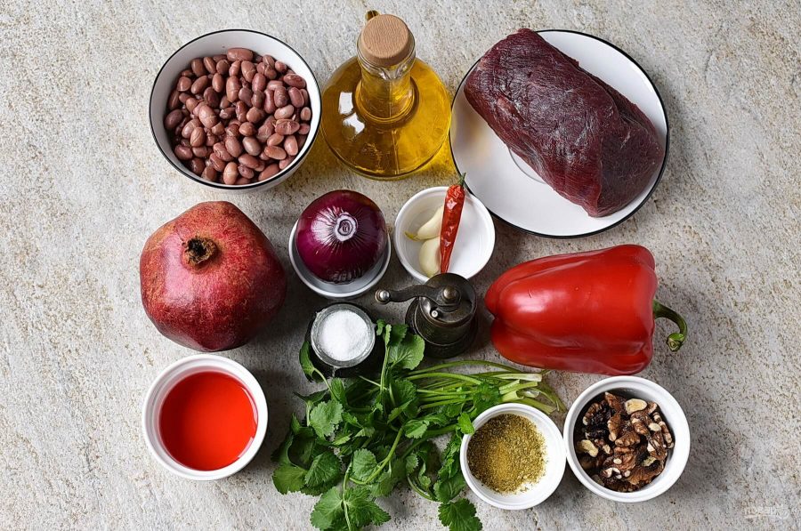 Гранат в салате "Тбилиси" используют не только для украшения, но и для заправки. Важно, чтобы он был свежим и спелым. Говядину для салата следует опускать в подсоленную кипящую воду, так мясо будет сочнее. Остужать мясо лучше в бульоне. Консервированную фасоль для салата следует откинуть на сито, ополоснуть холодной водой и хорошо обсушить.Состав / Ингредиенты: