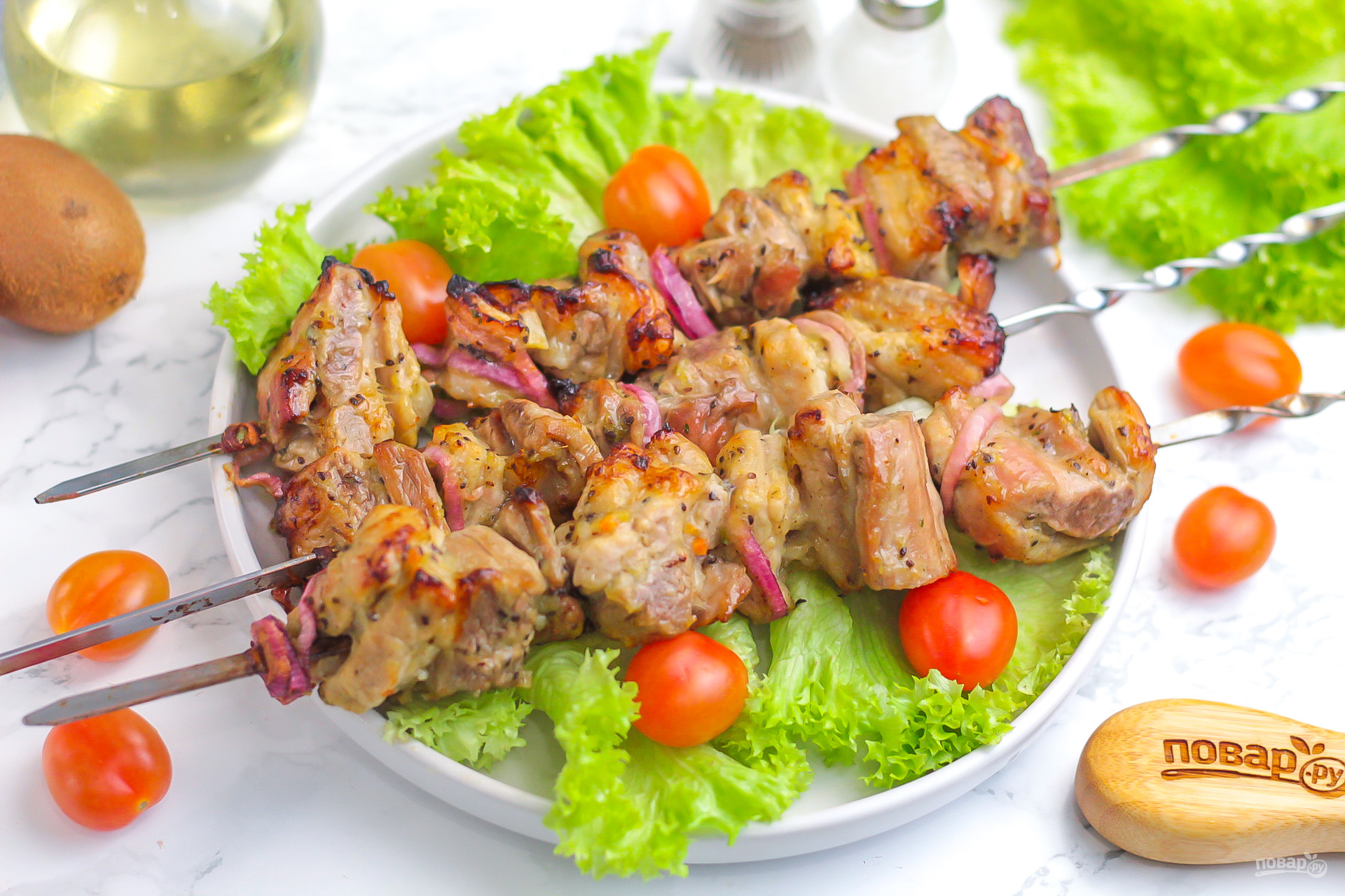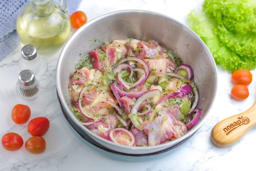 Разожгите угли в мангале, на гриле и дождитесь постоянного жара. Выложите шампура на гриль и обжарьте не более 15-0 минут, проворачивая их для равномерного приготовления. Подайте шашлыки с киви на стол горячими с различными соусами, зеленью, свежими овощами. Приятного вам аппетита!