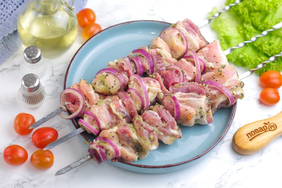 Подготовьте указанные продукты. Выбирайте либо свиную шею, либо подчеревок — в них есть сальные прожилки и поэтому шашлык получится сочный, вкусный.