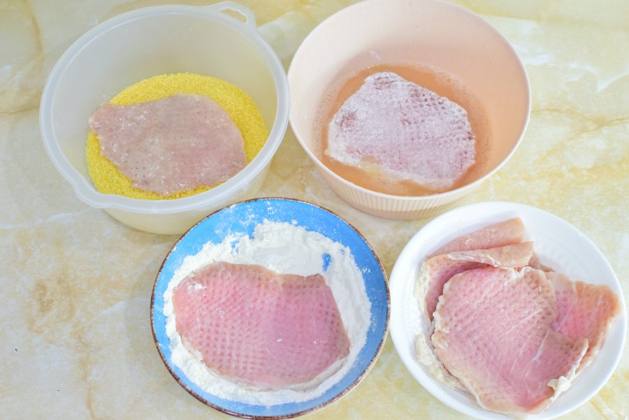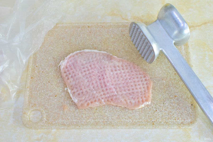 Каждый кусочек мяса отбейте кухонным молоточком. При отбивании накройте мясо пленкой, чтобы не летели брызги.