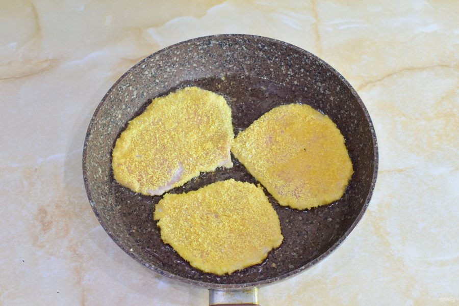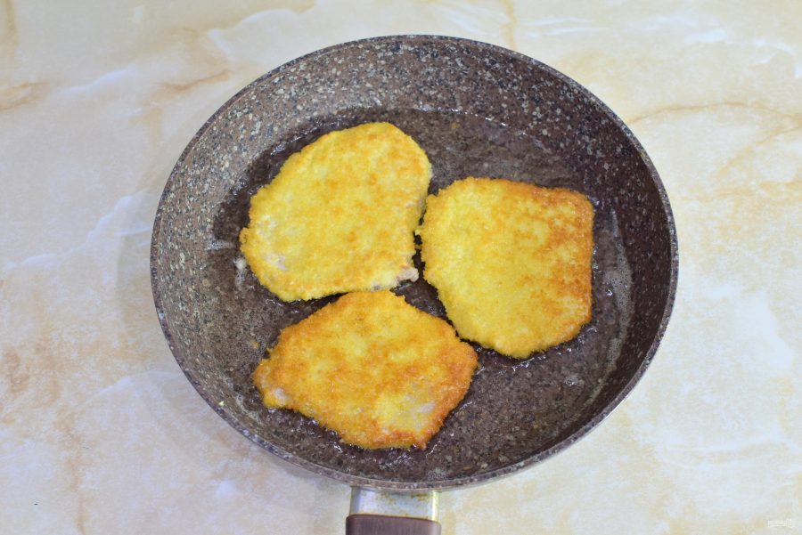 На горячую сковороду налейте растительное масло и обжарьте шницели с двух сторон примерно по 2-3 минуты с каждой стороны.