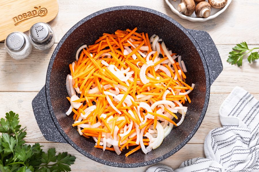 Репчатый лук нарежьте полукольцами, а морковь очистите и натрите на терке. Шампиньоны помойте и обсушите, нарежьте пластинами или на ломтики среднего размера.