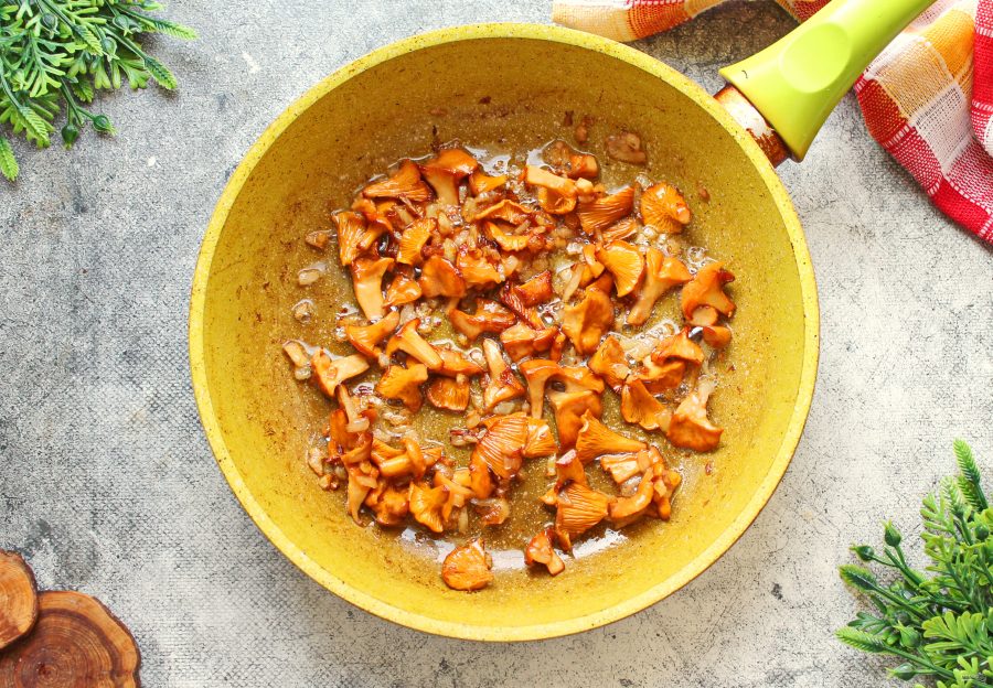 Обжаривайте лисички на среднем огне, пока вода не испариться, а грибы немного обжарятся. На это уйдет примерно 10-15 минут.