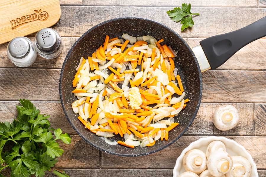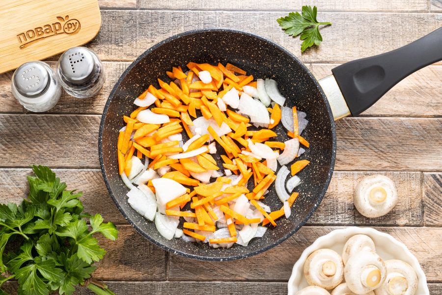 Разогрейте сковороду на среднем огне с растительным маслом. Обжарьте до золотистого цвета и мягкости репчатый лук с морковью.