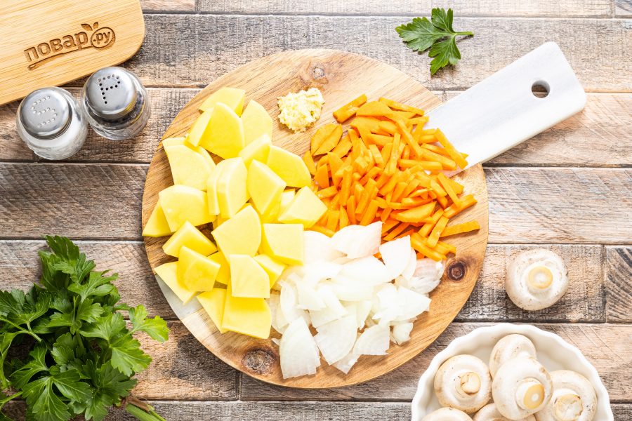 Морковь очистите, нарежьте соломкой или натрите на терке. Репчатый лук нарежьте полукольцами, а картофель очистите и нарежьте ломтиками среднего размера. Чеснок пропустите через пресс.
