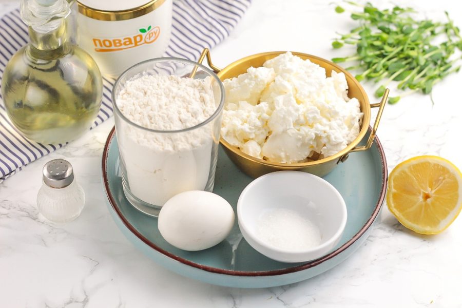 Подготовьте указанные продукты. Творог выбирайте не кислый, влажный, а не крупинистый, чтобы он отлично склеивался.