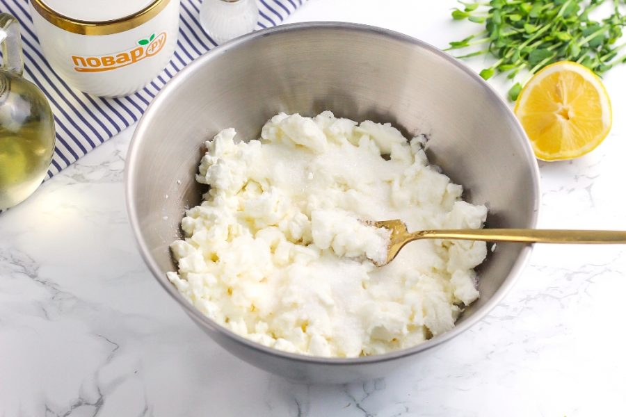 Выложите творог в глубокую миску и помните вилкой. Добавьте сахар и соль.