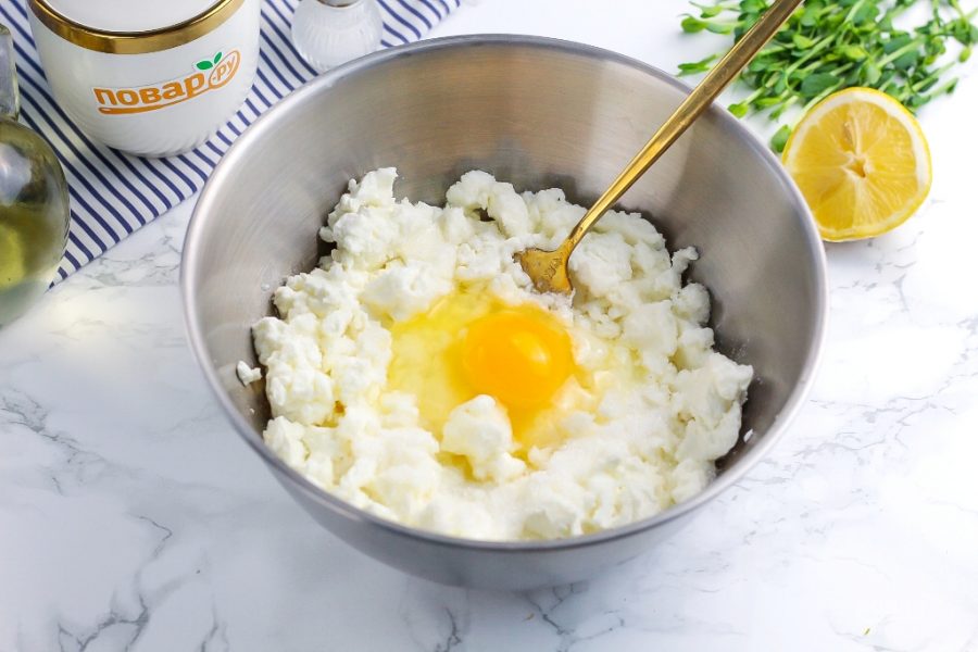 Вбейте в творожную массу куриное яйцо. Тщательно все перемешайте вилкой.