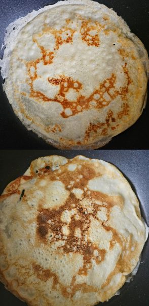 Прогрейте сковороду на плите и влейте на нее часть теста. Так как тесто заваривается, то ему не нужно давать время на "отдых", чтобы активировалась клейковина. Испеките блины с каждой стороны по 1 минуте.