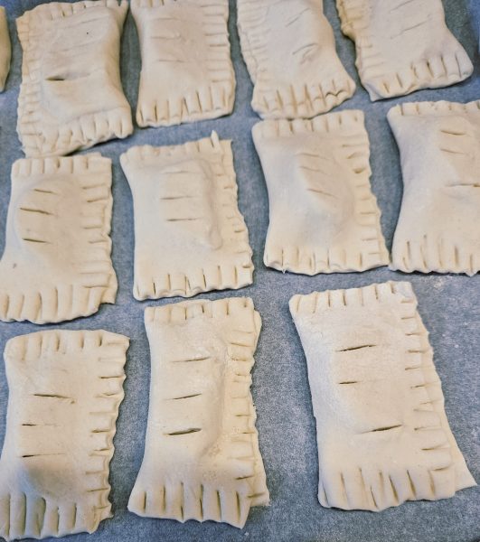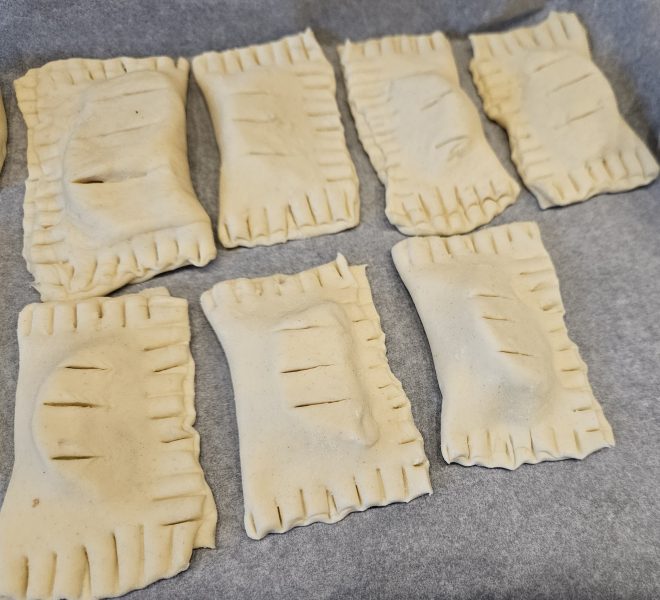 Также поступите с остальным тестом и начинкой. Можно сделать несколько вариантов пирожков. Выложите ваши турноверы на противень с пергаментом для выпечки.