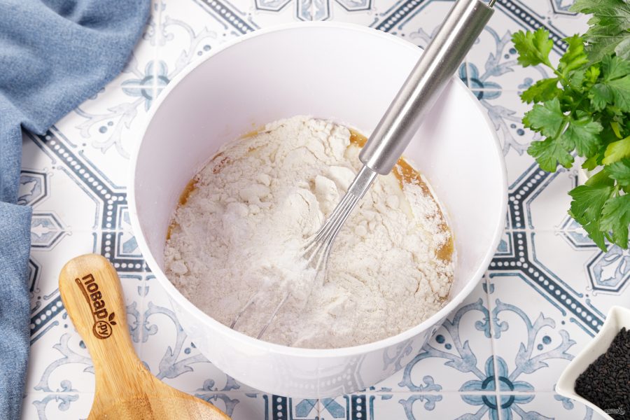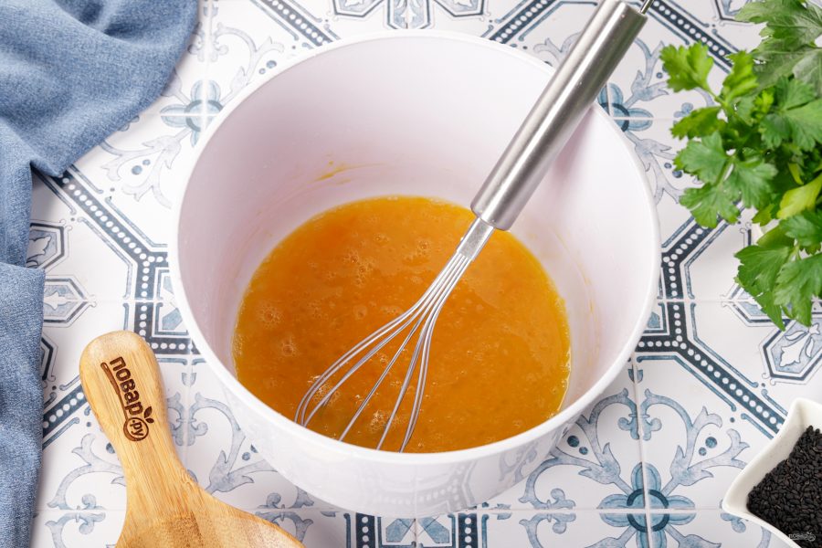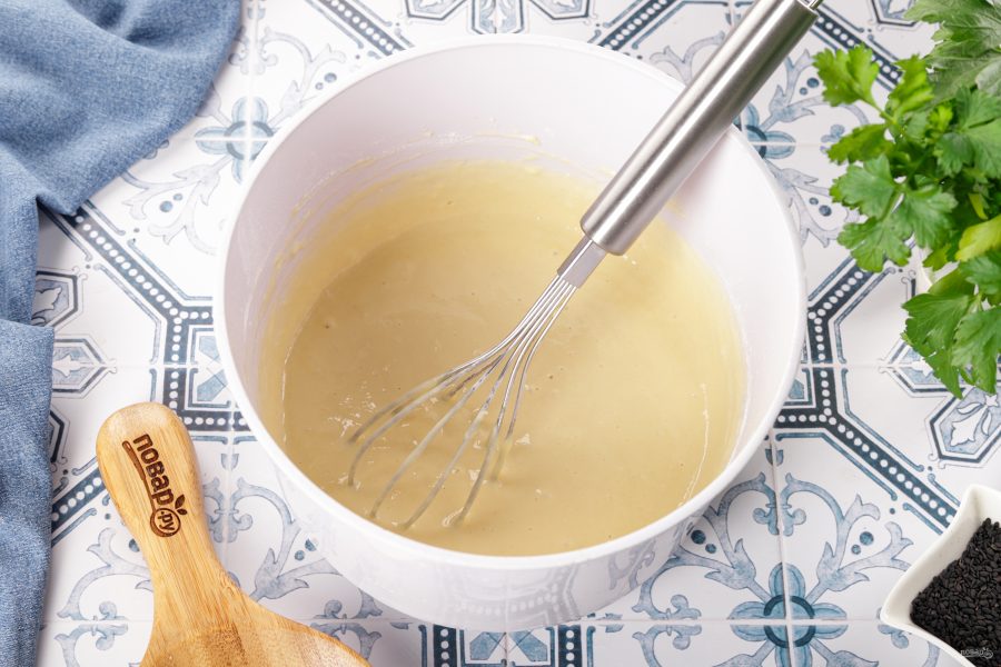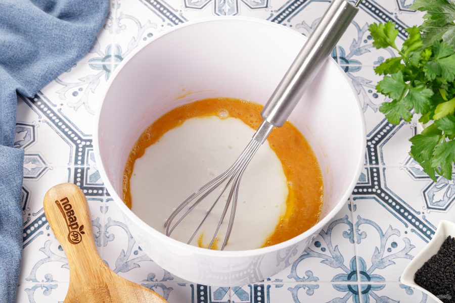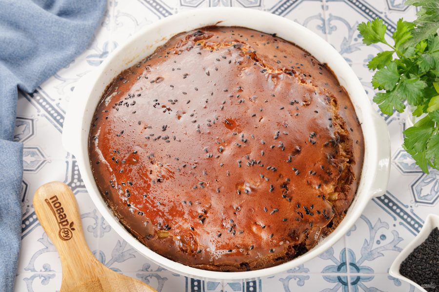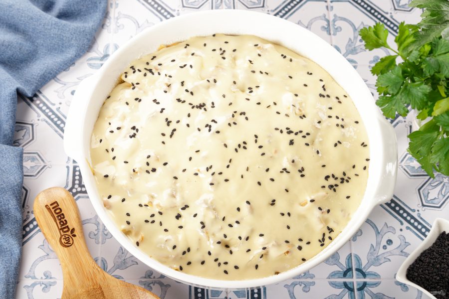 Затем сверху залейте остатки теста, осторожно распределите его, чтобы вся поверхность пирога была покрыта. Мягкое тесто пропитает вкусную начинку, соединив все компоненты между собой. Посыпьте кунжутом. Поставьте выпекать в разогретую до 180 градусов духовку на 25-30 минут. Ориентируйтесь по румяному верху.
