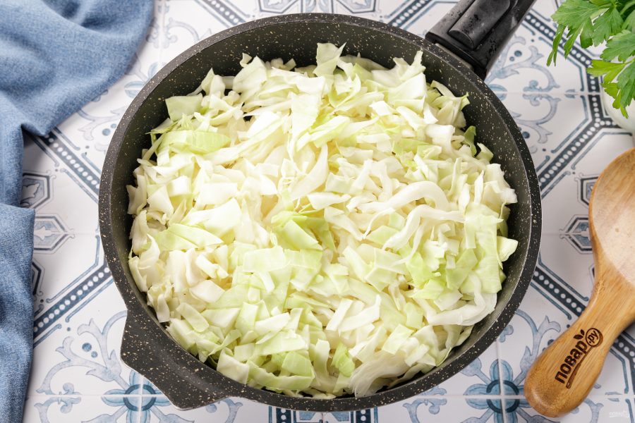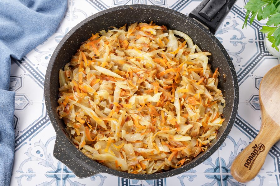 Тушите, периодически помешивая, до желаемой степени готовности капусты. Молодая капуста будет готова быстрее, чем капуста старого урожая. Готовую начинку переложите в миску, чтобы она остыла.