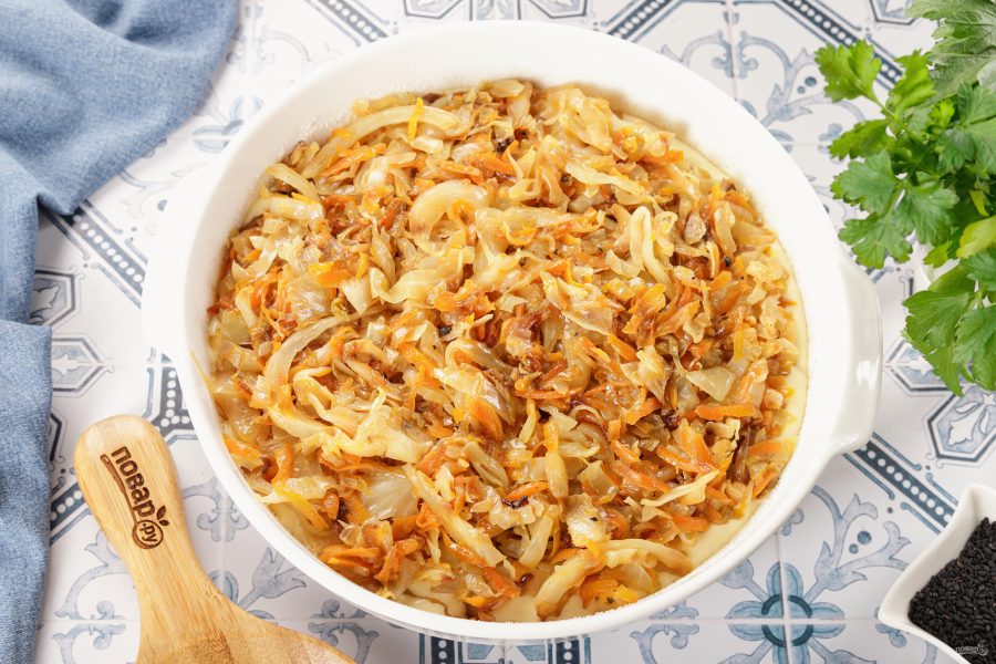 Жаропрочную форму с бортиками смажьте маслом. Дно и бока присыпьте мукой или манкой. Вылейте половину подготовленного теста в форму и лопаткой или ложкой аккуратно распределите по всей форме ровным слоем. Готовую начинку из капусты, равномерно разложите на нижний слой заливного теста. Важно не оставлять «белых пятен», чтобы потом каждый кусочек пирога был наполнен вкусной начинкой.